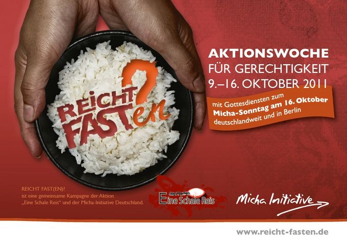 (Bad Blankenburg/Frankfurt/Leipzig) „Reicht eine Schale Reis am Tag?“ Diese Frage möchten die Micha-Initiative Deutschland und die Aktion „Eine Schale Reis“ während einer Aktionswoche vom 9. bis 16. Oktober 2011 stellen. In der Woche, die unter dem Motto „REICHT FAST(EN)?“ steht, sind insbesondere Gemeinden und christliche Gruppen eingeladen, sich an einem Selbstversuch zu beteiligen. Es geht darum, persönlich nachzuempfinden, mit wie wenig ein Drittel der Weltbevölkerung pro Tag auskommen muss: Mit nur einer Schale Reis. Am 16. Oktober wird die Aktion an verschiedenen Orten deutschlandweit mit Gottesdiensten zum „Micha-Sonntag“ abgeschlossen.