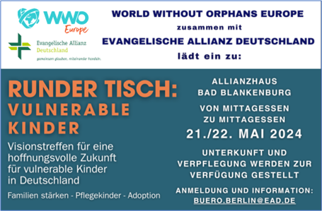 Welt ohne Waisen entsteht als Initiative in der Evangelischen Allianz in Deutschland – inklusive Spendennummer. Dazu darf das Logo der ‚World without Orphans‘-Bewegung adaptiert werden, was ausdrückt, dass die neue glaubensbasierte Initiative in Deutschland eng mit der internationalen Bewegung verbunden ist. Eine Roadmap beschreibt die Vision, Ziele und mögliche Betätigungsfelder.